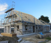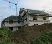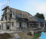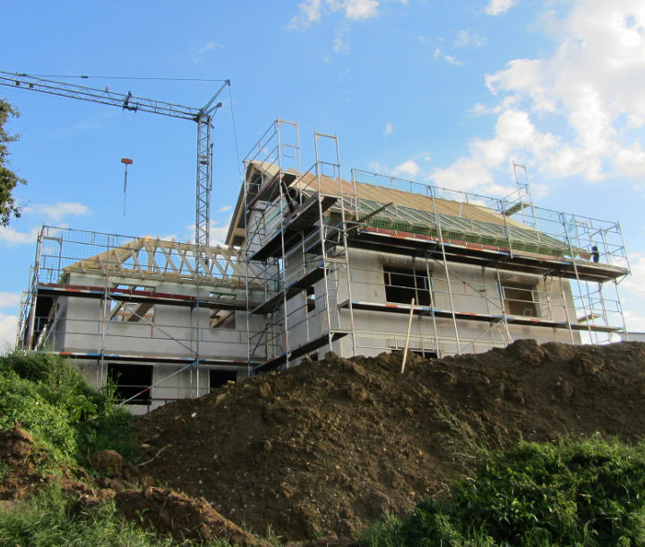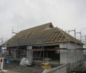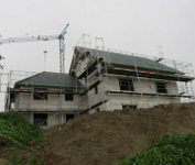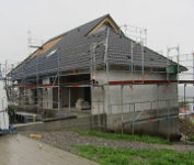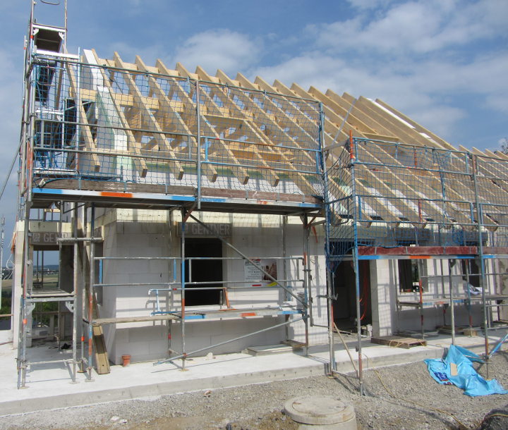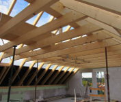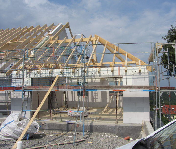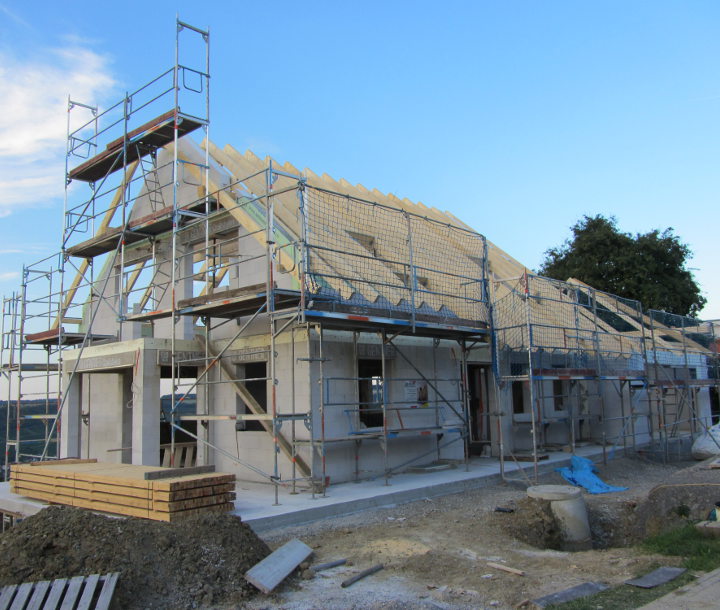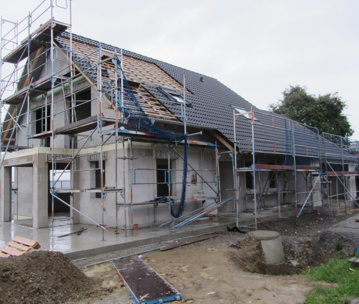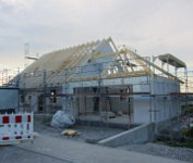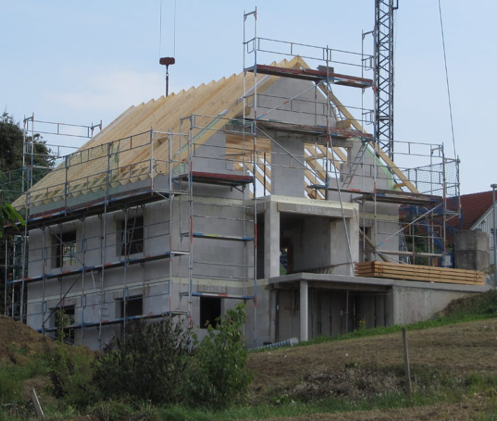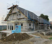 Trotz starkem Regen haben die Zimmerer die Dachdeckarbeiten fortgesetzt und die Fenster wurden auch schon angeliefert.
