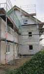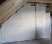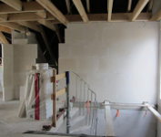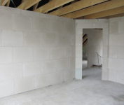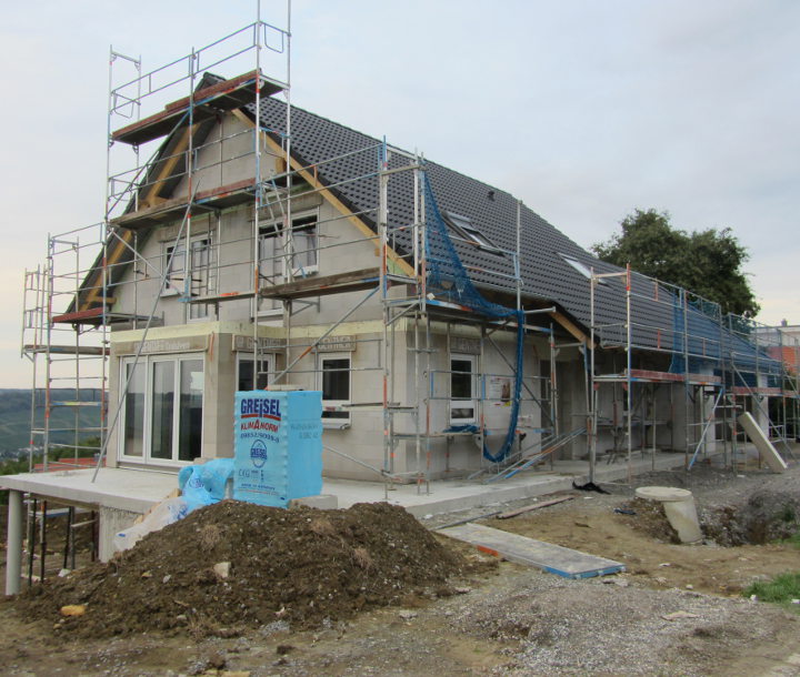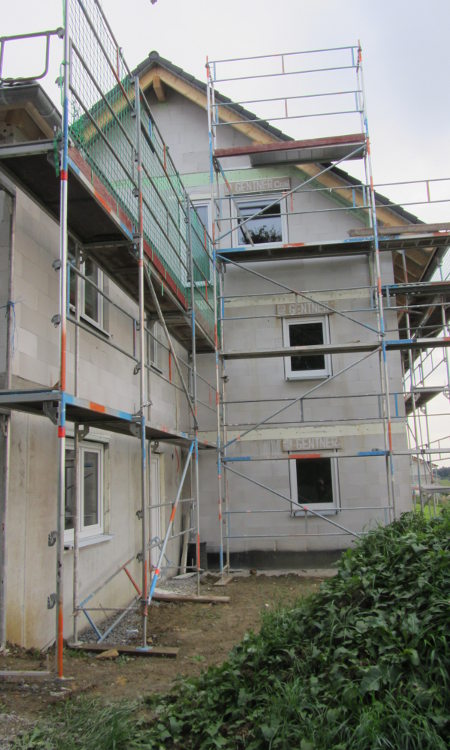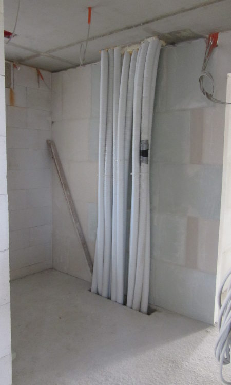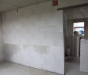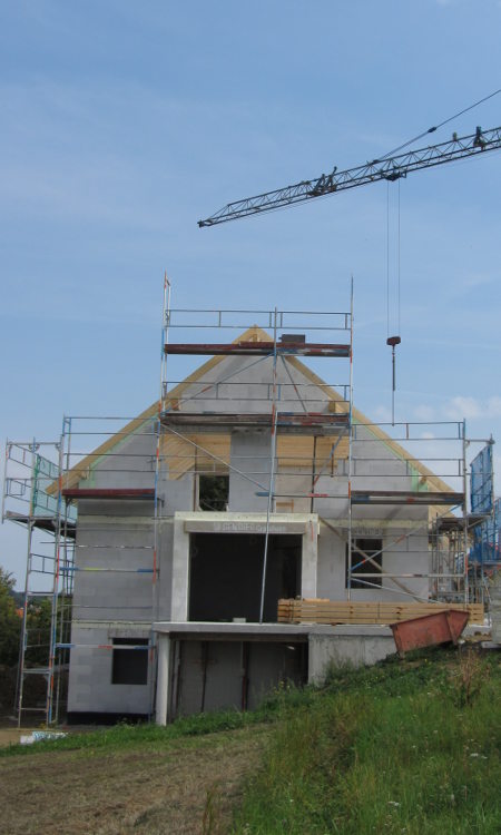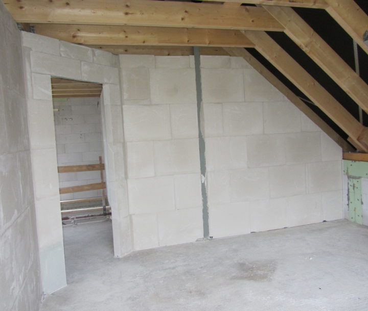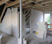 Die Zimmerer haben heute die OSB-Platten in der Garage angebracht. Gleichzeitig wurde die Zwischenwand im Büro gemauert und im OG mit den Gips-Wandbauplatten begonnen.