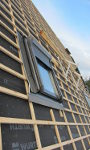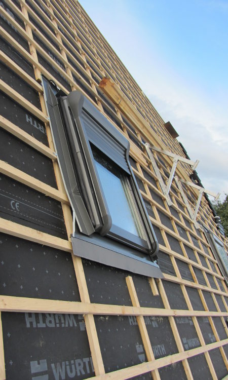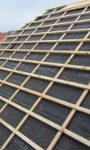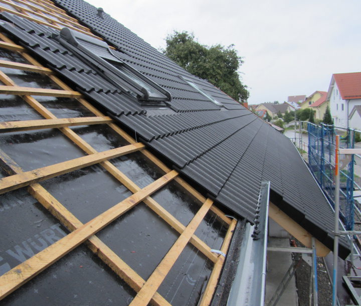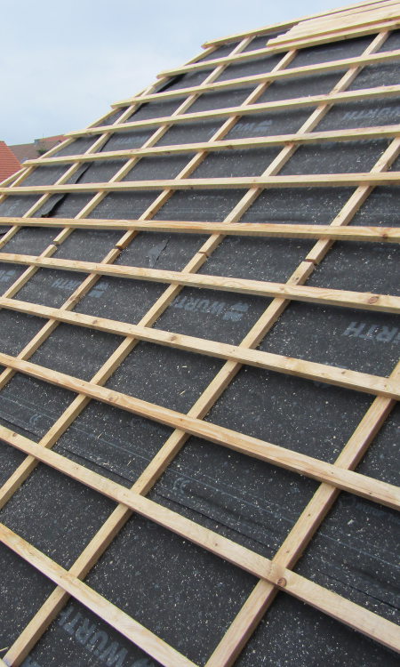 Das Dach ist dicht! Die Unterspannbahnen wurden komplett angebracht und die Dachlatten für die Ziegel wurden auch schon angebracht: