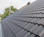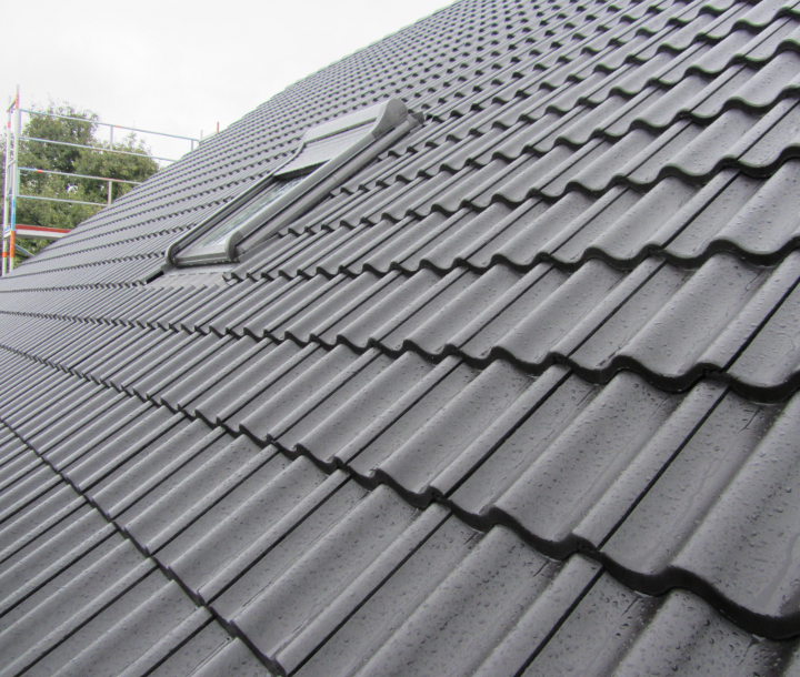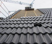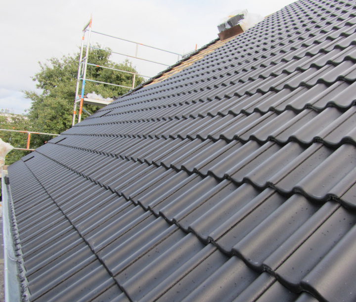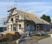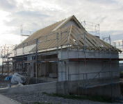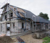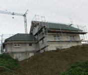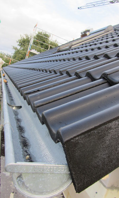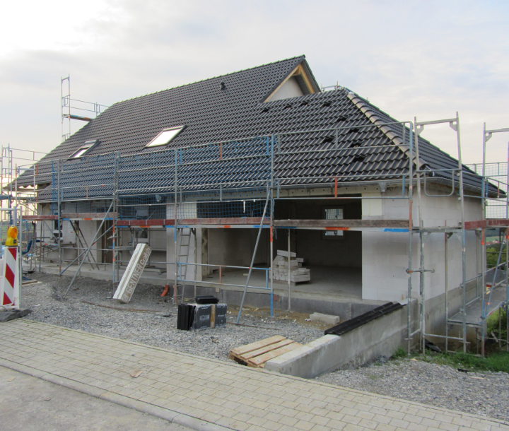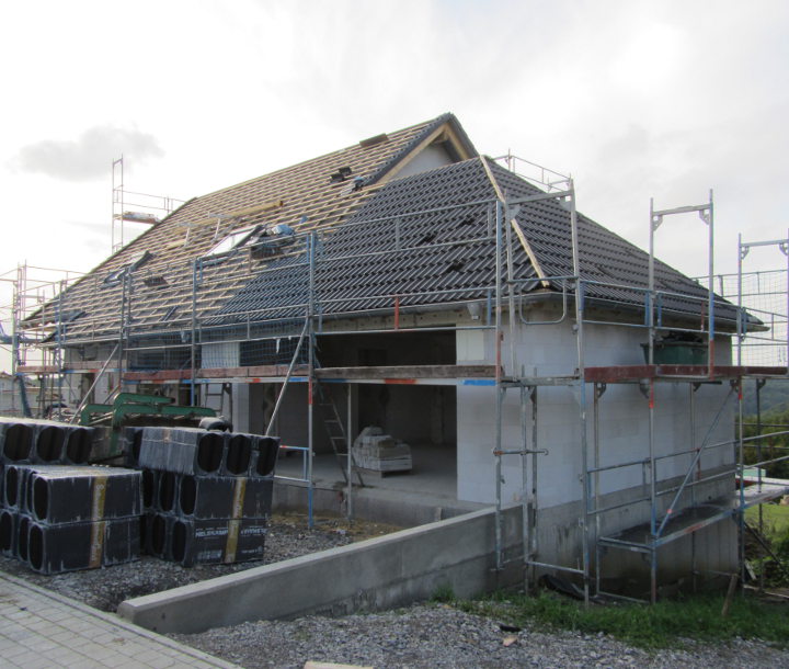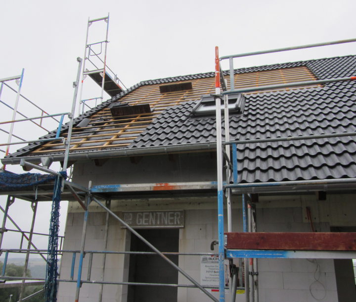 Bis auf ein paar Firstziegel auf der Garage haben die Zimmerer alle Ziegel angebracht.