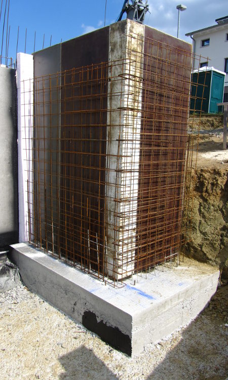 Neben dem Ausschalen der Kellerdecke über der Garage wurde heute ein Teil der Stützmauer für die Terrasse betoniert: