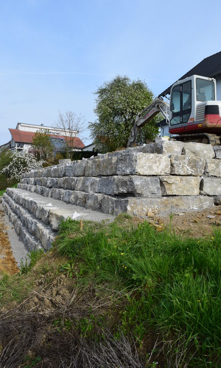 Heute wurde mit den ersten Baggerarbeiten für unsere Natursteinmauer begonnen: